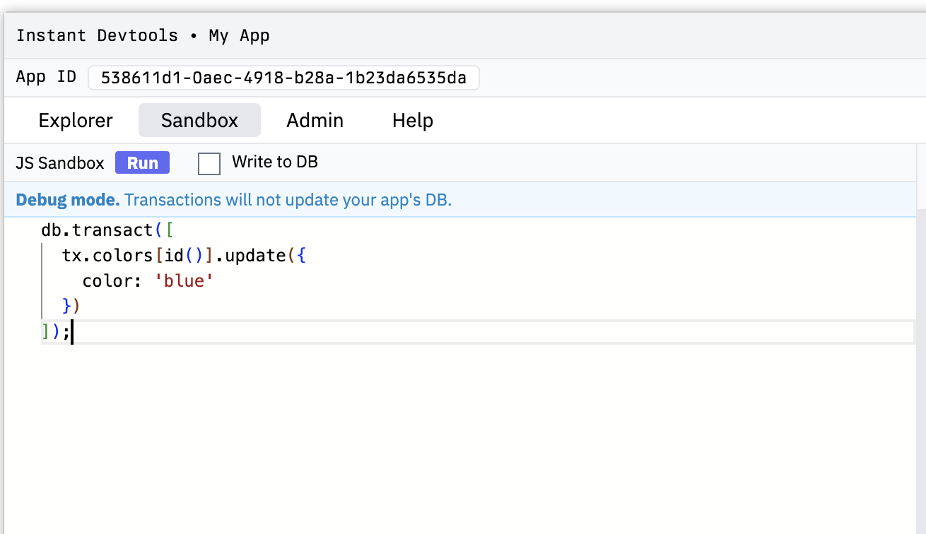 import { init } from '@instantdb/react'; import schema from '../instant.schema.ts'; const db = init({ appId: process.env.NEXT_PUBLIC_INSTANT_APP_ID!, schema, devtool: { allowedHosts: ['localhost', 'site.local'], }, });