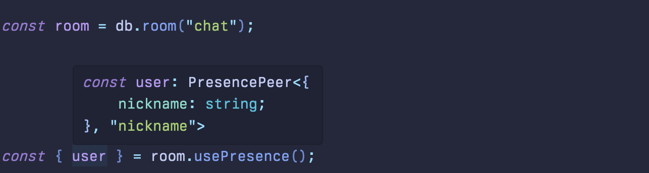 import { PresencePeer } from '@instantdb/react'; import { AppSchema } from '../instant.schema.ts'; import { db } from '../lib/db.ts'; type ChatPeer = PresencePeer<AppSchema, 'chat'>; // Result: { peerId: string; avatar: string; name: string } const room = db.room('chat') function UserAvatar({ peer }: { peer: ChatPeer }) { return ( <div> <img src={peer.avatar} alt={peer.name} /> </div> ); } function OnlineAvatars({ name, avatar }: { name: string; avatar: string }) { // Subcribe and publish initial presence const { user: myPresence, peers } = db.rooms.usePresence(room, { initialPresence: { name, avatar }, }); // Render my avatar and all peer avatars return ( <div> {myPresence && <UserAvatar key={myPresence.peerId} peer={myPresence} />} {Object.values(peers).map((peer: ChatPeer) => ( <UserAvatar key={peer.peerId} peer={peer} /> ))} </div> ); }